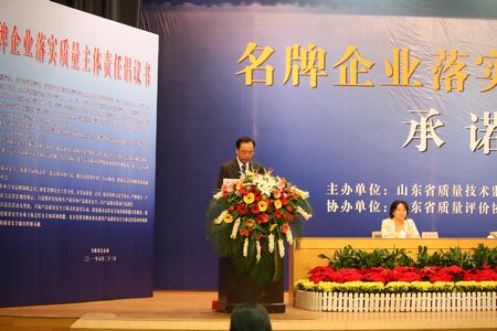 5月23日,为了落实国家质检总局和工业和信息化部联合下发的《关于生产企业全面落实产品质量安全主体责任的指导意见》文件精神,充分发挥名牌企业落实企业质量主体责任表率和带动的作用,促进全省企业全面落实产品质量安全主体责任,强化质量主体责任意识。由省质监局、省经信委联合主办,省质量评价协会协办的名牌企业落实质量主体责任承诺大会在济南隆重召开。省质监局副巡视员王光辉、省经信委科技处调研员封宗庆等有关领导出席会议并讲话。济南、泰安、莱芜、德州、滨州、聊城市山东名牌产品企业法人、质量部门负责人,有关市质监局质量管理人员,省各大新闻媒体等400余人参加了会议。